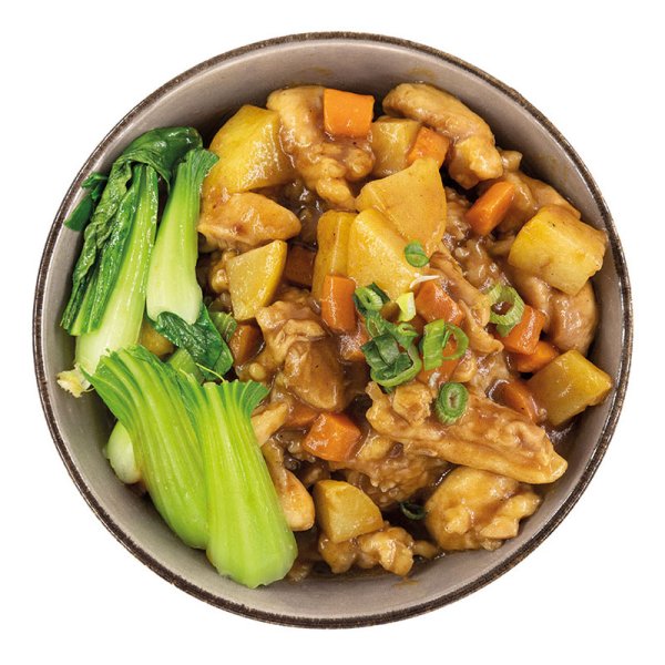 DONBURI CHICKEN CURRY IL riso bianco, pollo cotto in salsa curry giapponese, carote e sesamo, patate e pak choi