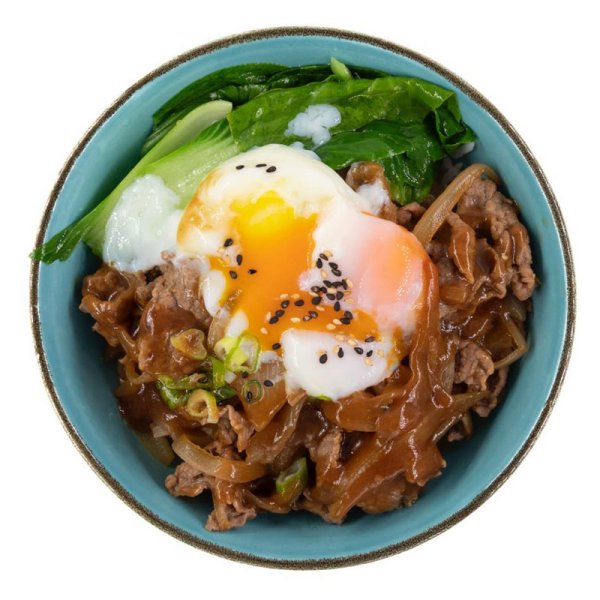 Base di riso bianco, manzo con cipolle cotto in salsa sukiyaki, pak choi, uova e sesamo