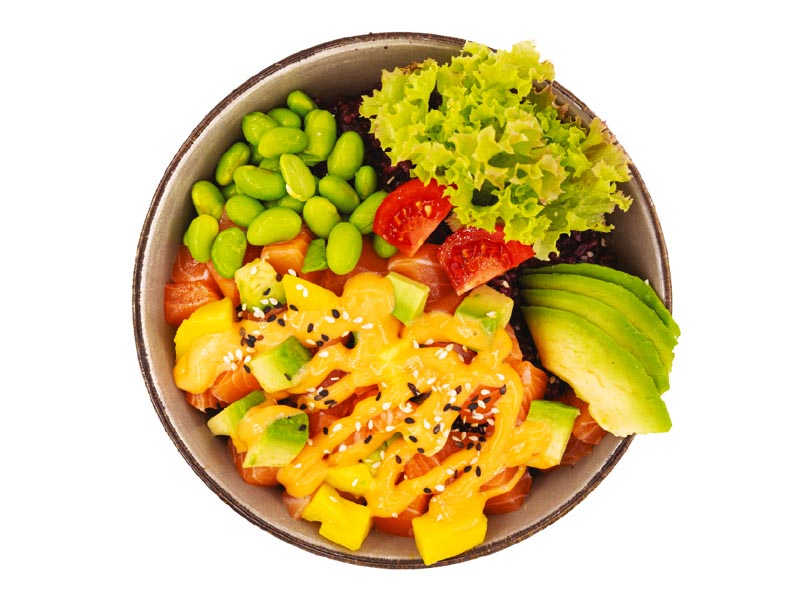 Riso venere, salmone, edamame, avocado, mango, pomodorini, sesamo, salse di soia e teriyaki